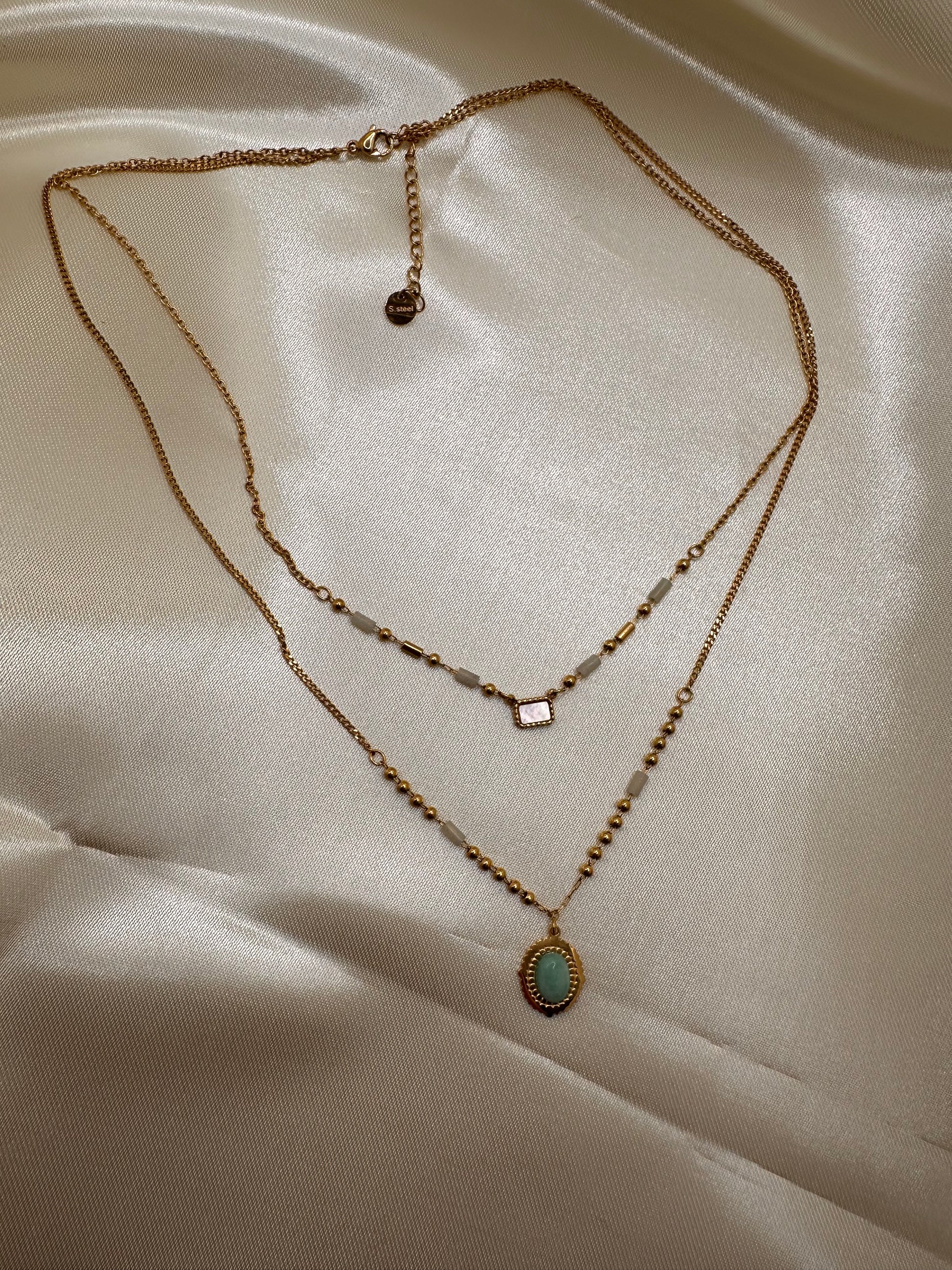Ce collier de 40 cm + 3 cm d'extension est composé de deux rangs élégants. Le premier rang est orné de perles en pierres naturelles et de petits détails géométriques subtils. Le second rang met en valeur un pendentif ovale délicatement serti, offrant une touche sophistiquée et raffinée.