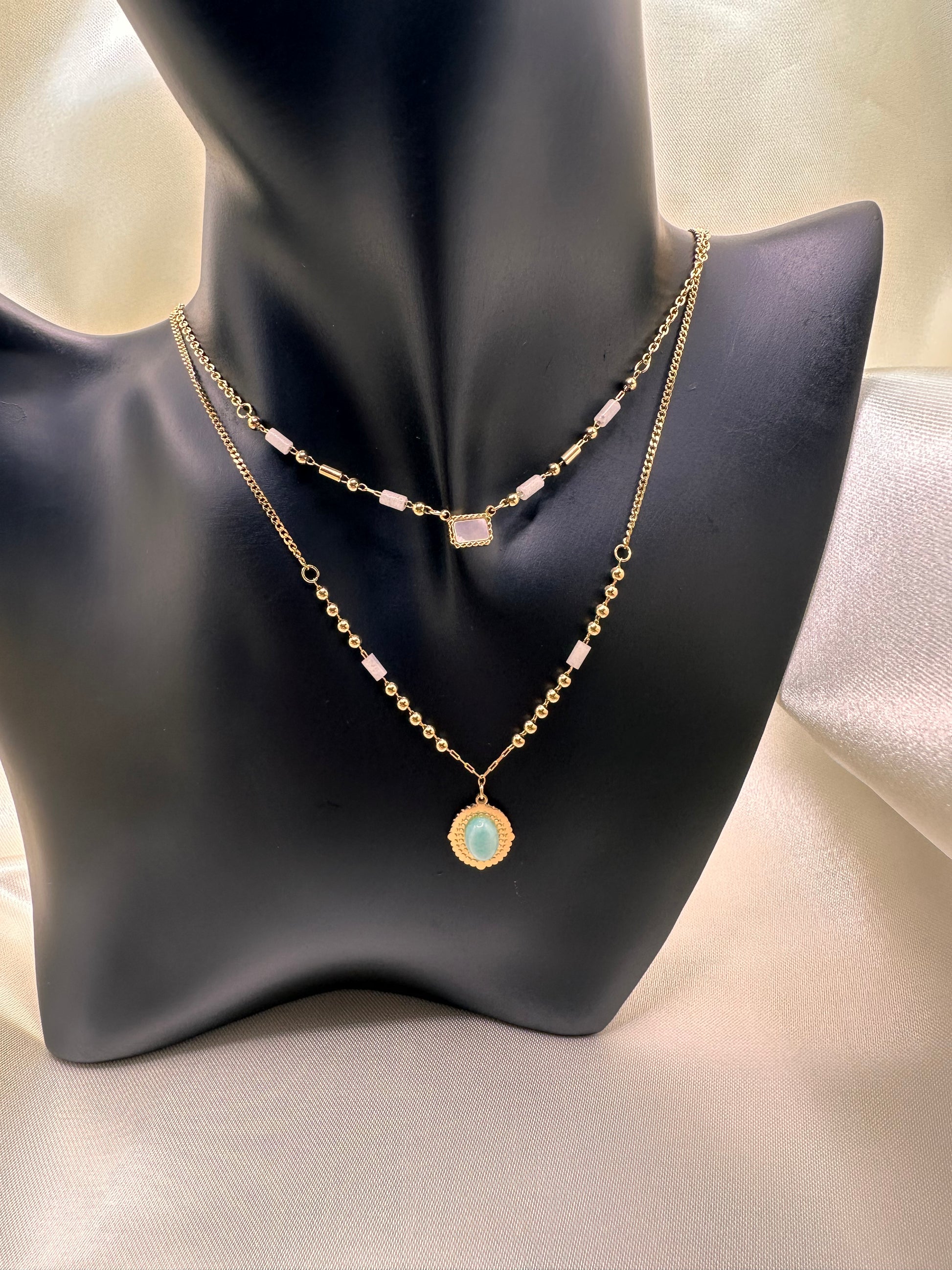 Collier Double Rang avec Pierres Naturelles et Pendentif Ovale.